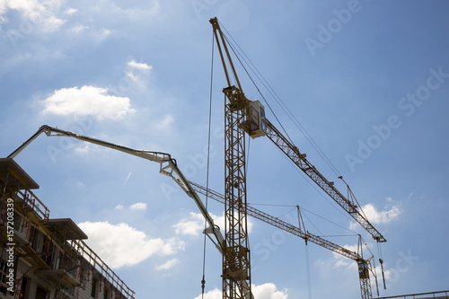 site, crane, blue, sky, background, house, work, progress, future, technology, industry, heavy, urban, city, building, build, equipment, architecture, workplace, construction, high, engineering, place, street, manual, teamwork, developing, profession, helmet, hook, chain, cloud, sun, white, men at work, scene, mechanical, lift, lifting, worked, 2, machine, machinery