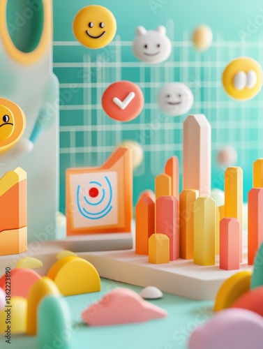 Consumer sentiment analysis with emotive icons and colorful charts, personalized insights, 3D illustration