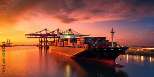 Container Ship Docked at Port during Sunset. Transportation, Cargo, and Shipping Industry. Generative AI illustrations