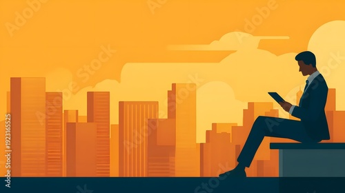 Contemplation in the Cityscape: Silhouette of a businessman absorbed in digital device, seated on a ledge, overlooking a vibrant city horizon.