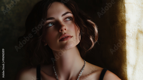portrait, brunette woman, window, contemplative, blacktop, cinematic, artistic, moody, thoughtful, elegant, serene, soft light, introspective, photo