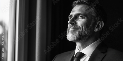 businessman, professional, contemplative, office, suit, thoughtful, graying, beard, looking, out