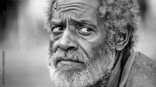 homeless, elder, man, contemplative, expression, black, white, coarse, beard, grey, skin, downtown, poverty, aged, lonely, despair, destitute, sorrowful, thoughtfulness, rough, gritty, street, urban, wrinkled, trouble, pensive