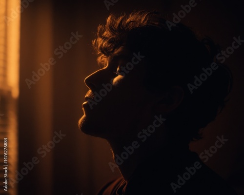 person, profile, contemplative, silhouette, light, shadow, man, portrait, indoor, night, darkness, calm, thoughtful, introspective, pensive, closeup, brown hair, emotion, feeling, interior, unclear, nobody, adult, male