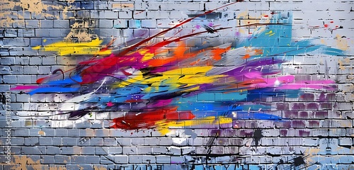 Contemporary art concept with colorful spray paint strokes on textured brick wall, enhancing modern interiors