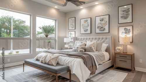 Contemporary bedroom with built-in lighting, neutral palette, and framed artwork