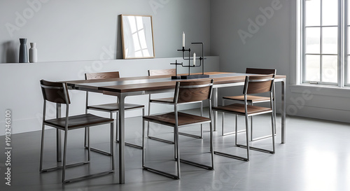 Contemporary dining set with dark wood grain surfaces and brushed steel frames. Minimalist Interior Design