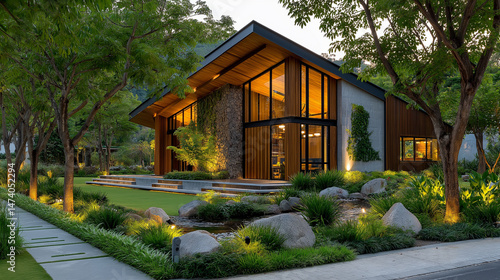 Contemporary Dream Home: A luxurious modern house featuring an innovative architecture, with well-manicured landscaping, perfect blend of natural and man-made elements.
