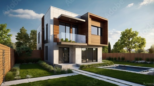 Contemporary duplex with shared green yard, clean lines, city background, 3D architectural photography