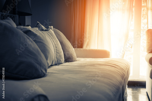contemporary interior of Living room with part of sofa in sunny day and white curtain interior background concept