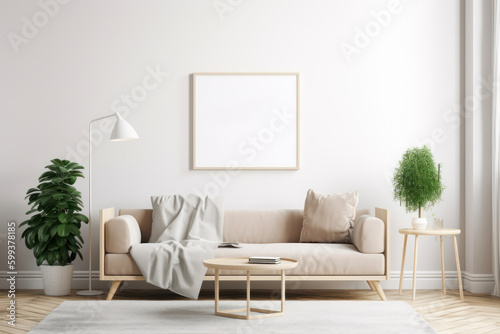 Contemporary Living Room with Blank Horizontal Poster Frame and Natural Light