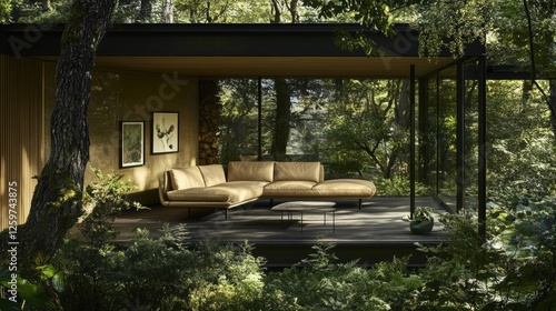 Contemporary Living Space Surrounded by Lush Greenery Emphasizing Minimalist Design Aesthetic