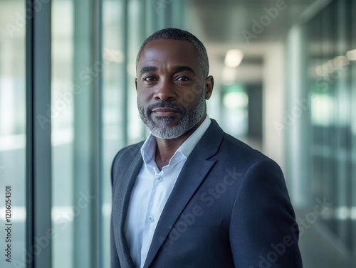 contemporary office portrait of confident black businessman in modern glass corridor, natural lighting, professional atmosphere