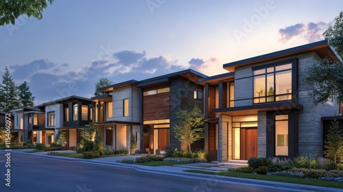 Contemporary residential neighborhood with modern architecture illuminated at dusk showcasing stylish homes and landscaped surroundings