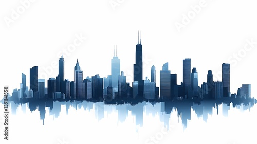 Contemporary Skyline Illustration: Modern Urban Silhouette with Blue Tones and Reflection