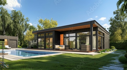 Contemporary Two-Story Home with Black Roof, Light Gray Scheme, and Pool Surrounded by Nature. Generative AI