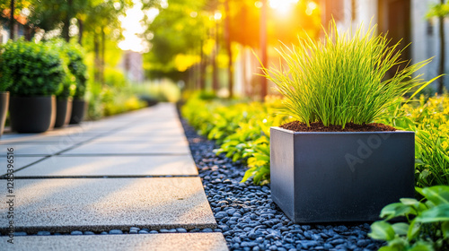 Contemporary urban park with square planters filled with lush grass and trees. Modern landscaping forms a tranquil city oasis. Pathways weave through greenery. Bright sunny day.