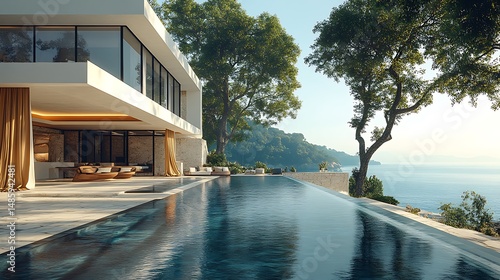 Contemporary villa overlooking ocean infinity swimming pool high resolution image