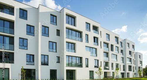 Contemporary White Residential Building with Numerous Windows and Balconies