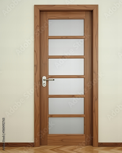 Contemporary wooden door featuring frosted glass panels, silver handle, and set against a neutral wall and parquet flooring