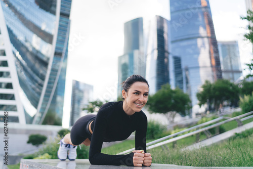 woman, plank, training, physical exercise, sport, smile, well-being, wellness, athlete, healthy, park, fitness, female, young, dark hair, activewear, city, bench, sportswoman, sporty, cheerful, content, active, motivation, strong, lady, isometric, exercise, glad, skyscraper, street, endurance, physical, confident, self-assured, stamina, effort, positive, fit, happy, delight, power, activity, abs, lifestyle, outdoors, looking away, full-length, full body
