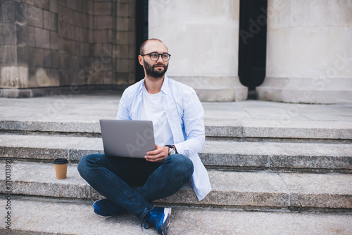 man, laptop, street, modern, delighted, content, using, surfing, bearded, male, spectacle, stair, casual clothes, hot drink, relish, browsing, relax, online, chill, wireless, cyberspace, connection, remote, freelance, leisure, device, contraption, holiday, enjoyment, careless, weekend, employee, designer, adviser, daylight, looking away