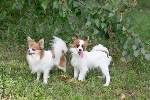 Continental toy spaniel puppy and chihuahua puppy are standing on a green grass in the summer park. Pet animals.