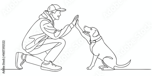 man, dog, high five, hand, paw, animal, pet, canino, labrador, line art, drawing, illustration, vector, graphic, black, white, outline, minimalist, simple, single line, training, friendship, bonding, interaction, happy, smiling, cap, hoodie, sneaker, collar, sitting, kneeling, gesture, positive, fun, playful, companionship, monochrome, isolated, design element, concept, vignetting