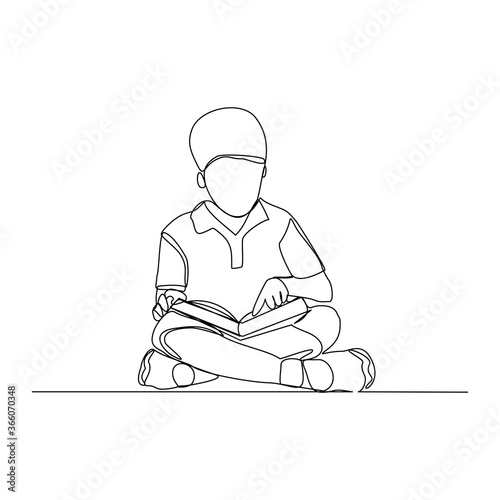 Continuous line drawing child boy sitting and read a book. Single line concept of education. Vector illustration