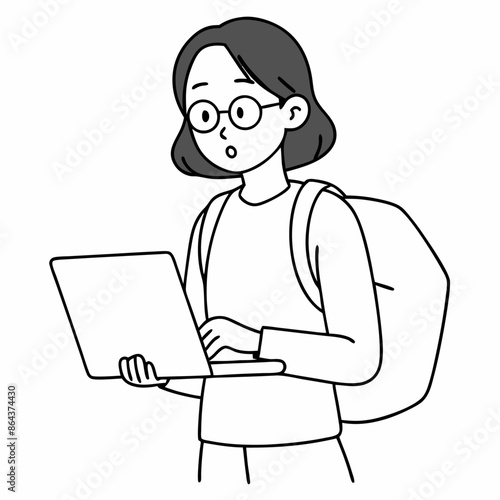 continuous line drawing of a surprised girl student with a backpack, wearing glasses, and using a laptop (16)