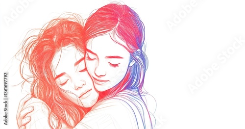 vector, concept, connection, care, person, girl, together, hugging, diverse, minimalism, togetherness, children, close, friendship, line, drawing, single line, team, support, caring, sisterhood, sister, friends, embracing, illustration, hug, love, white background, diversity, oneness, reunion, family, people