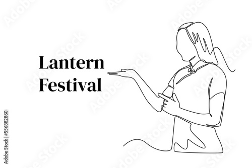 Continuous one line drawing happy young asian woman in chinese traditional clothing celebrate lantern festival. Lantern festival concept. Single line draw design vector graphic illustration.