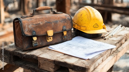 Contractor's briefcase open with site blueprints, safety forms, and a construction permit.