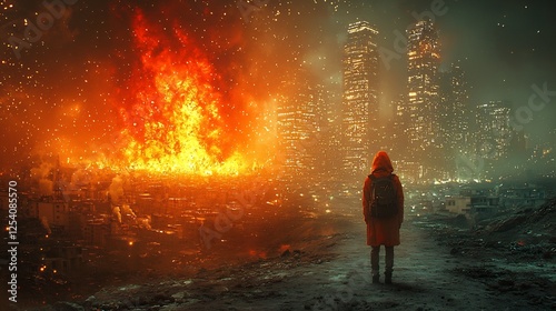 Contrasting imagery of poor rural village next to a modern industrialized city one side barren and dusty the other side glowing with lights and technology