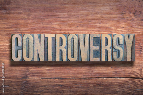 controversy, debate, challenged, discussion, argument, word, phrase, metaphor, letterpress, type, narrow, capital, vintage, weathered, texture, varnished, wooden, surface, detailed