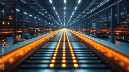 conveyer belt, industrial, interior, factory, assembly line, metal, blue, perspective, row, repetition, pipeline, equipment, automation, technology, production, manufacturing, structure, warehouse, distribution, machinery, engineering, efficiency, transport, logistic, modern, clean, blurred background, dark, glow, illumination, industrial building, assembly line, steel, neon, light, line, belt