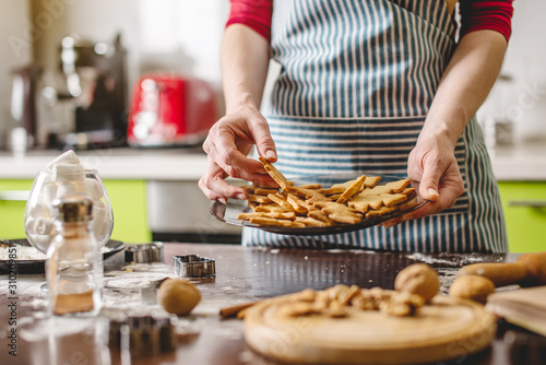 Cook housewife making cookies at home on a kitchen. Woman holding freshly baked cookies in the shape of Christmas trees