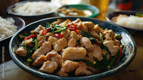 Cooked dish with pork, curry sauce, and morning glory served on rustic plate