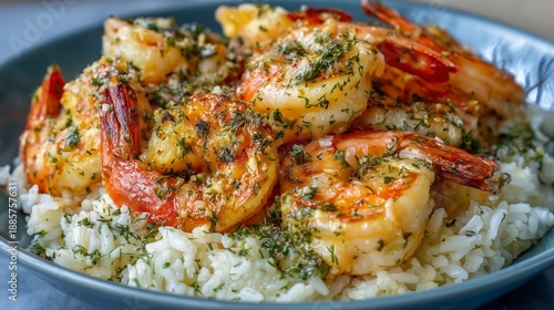 Cooked shrimp with garlic and fresh herbs serving on a bed of white rice