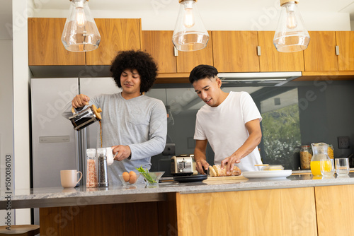 Cooking breakfast diverse male friends slicing bread and pouring coffee in home kitchen, with juice