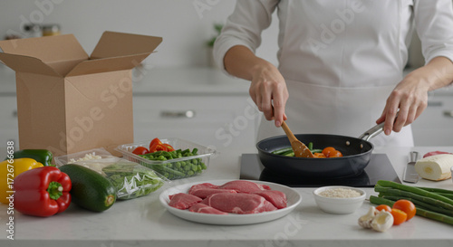 Cooking healthy meal with fresh vegetables and meat in kitchen