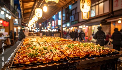 pizza, cooking, selling, stall, food, street, asian, lantern, illumination, evening, travel, culture, cookery, urban, city, people, standing, walking, eating, topping, green, sauce, market, chef, closeup, grill, tasty, fresh, shopping, delicious, dinner, meal