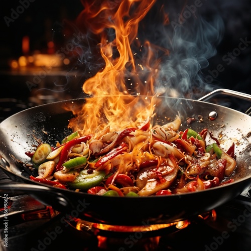 pan, food, cooking, vegetable, meal, meat, dinner, vegetable, dish, cookery, fried, pepper, hot, onion, healthy, red, chicken, plate, frying, seafood, lunch, rice, cook, green, shrimp, ai