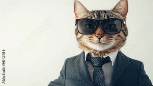 cat, suit, sunglasses, cool, fashion, animal, portrait, pet, felino, domestic, mammal, eye, face, serious, formal, professional, business, style, posh, stylish, gentleman, look, trendy, sharp, attitude, confident, closeup, indoor, studio, background, white, grey, black, attaching, collar, photo, photo, image