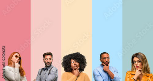 Cool group of people, woman and man doubt expression, confuse and wonder concept, uncertain future
