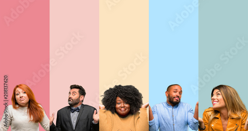 Cool group of people, woman and man doubt expression, confuse and wonder concept, uncertain future
