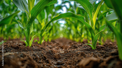 Corn plant field soil agriculture green farm crop sustainable growth Fresh corn plant field with rich soil and green leaf, sustainable agriculture