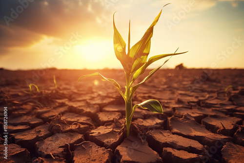Corn sprout on an empty dry field during a drought