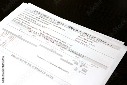 Coronavirus distribution research protocol 2019-nCoV. Information sheets of paper lie on a black surface.