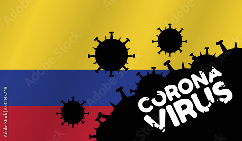 Coronavirus in Colombia. Flag of Colombia, words Corona Virus and virus silhouette